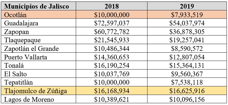 De los 11 municipios del estado que recibirán dinero vía Fortaseg, solamente Tlajomulco de Zúñiga obtuvo un ligero aumento. Por otra parte, los municipios de Arandas, Chapala, Autlán de Navarro, Cihuatlán, San Juan de los Lagos y Tala, que en el 2018 fueron contemplados, en este año ya no están.